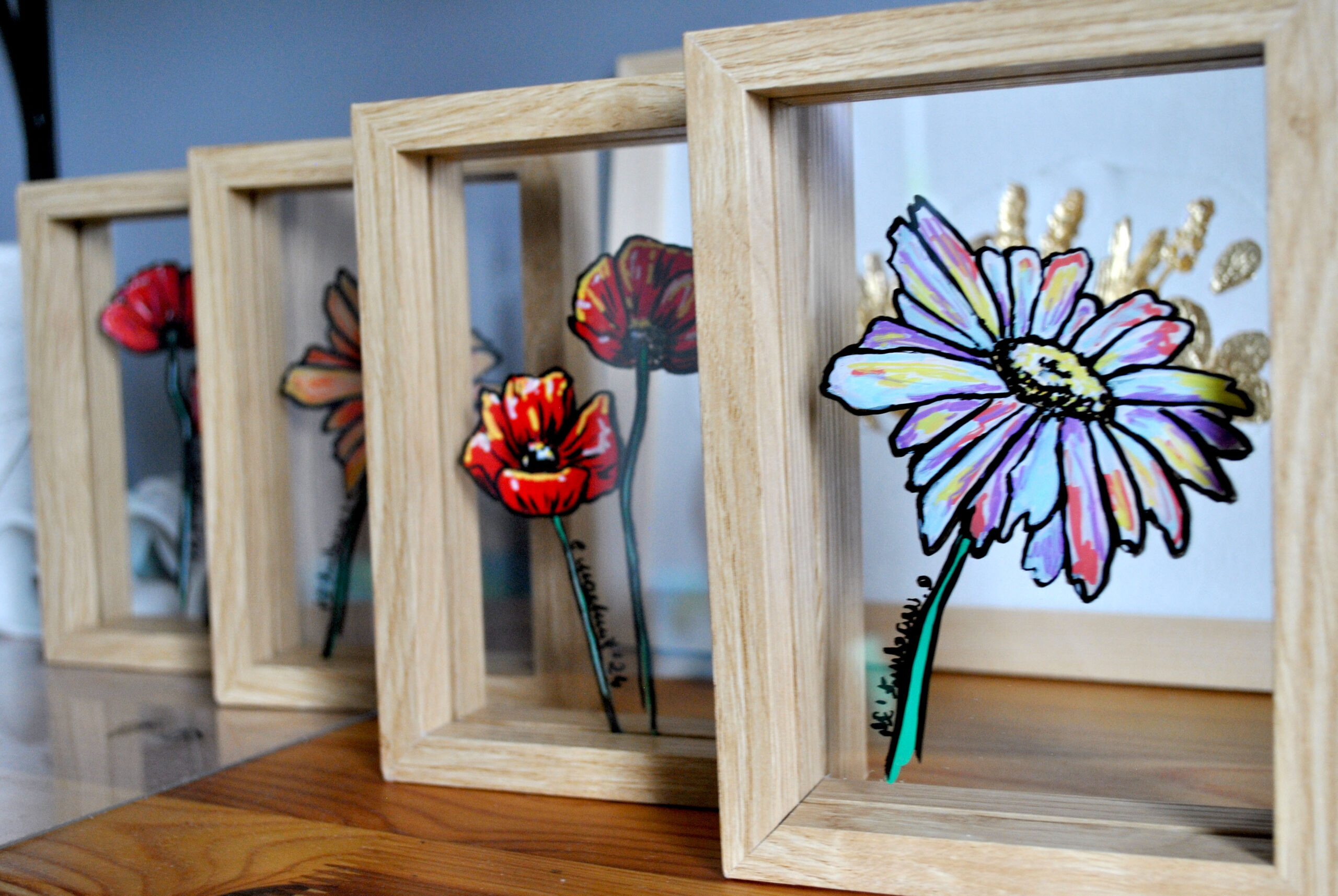 Kwiaty nagietka i rumianku, które zdobią obraz, wyłaniają się z tej kolorystycznej gry w pełnej krasie – ich płatki mienią się odcieniami pomarańczy, niebieskiego, bieli i żółci, tworząc harmonijny, lecz intensywny kontrast z tłem.