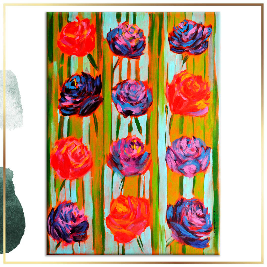 Każda z róży jest unikalna, z pogłębiającymi się cieniami i intensywnymi kolorami, co nadaje kompozycji dynamizmu i głębi.