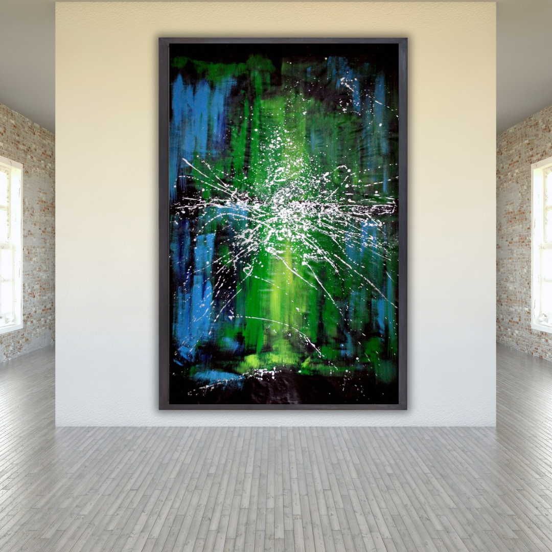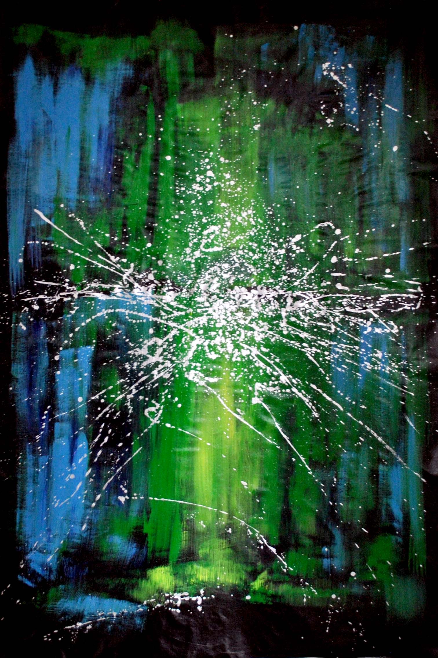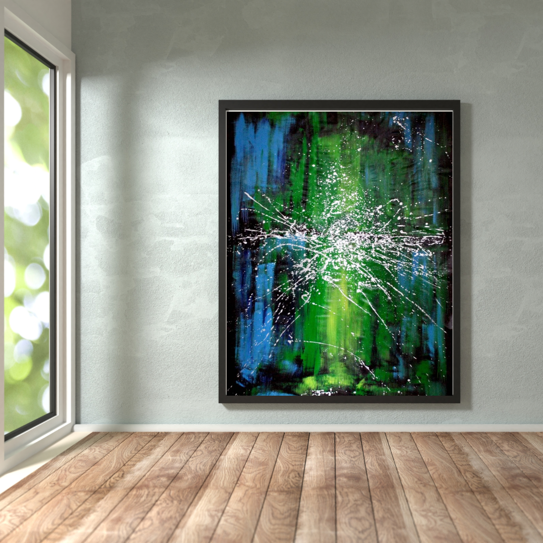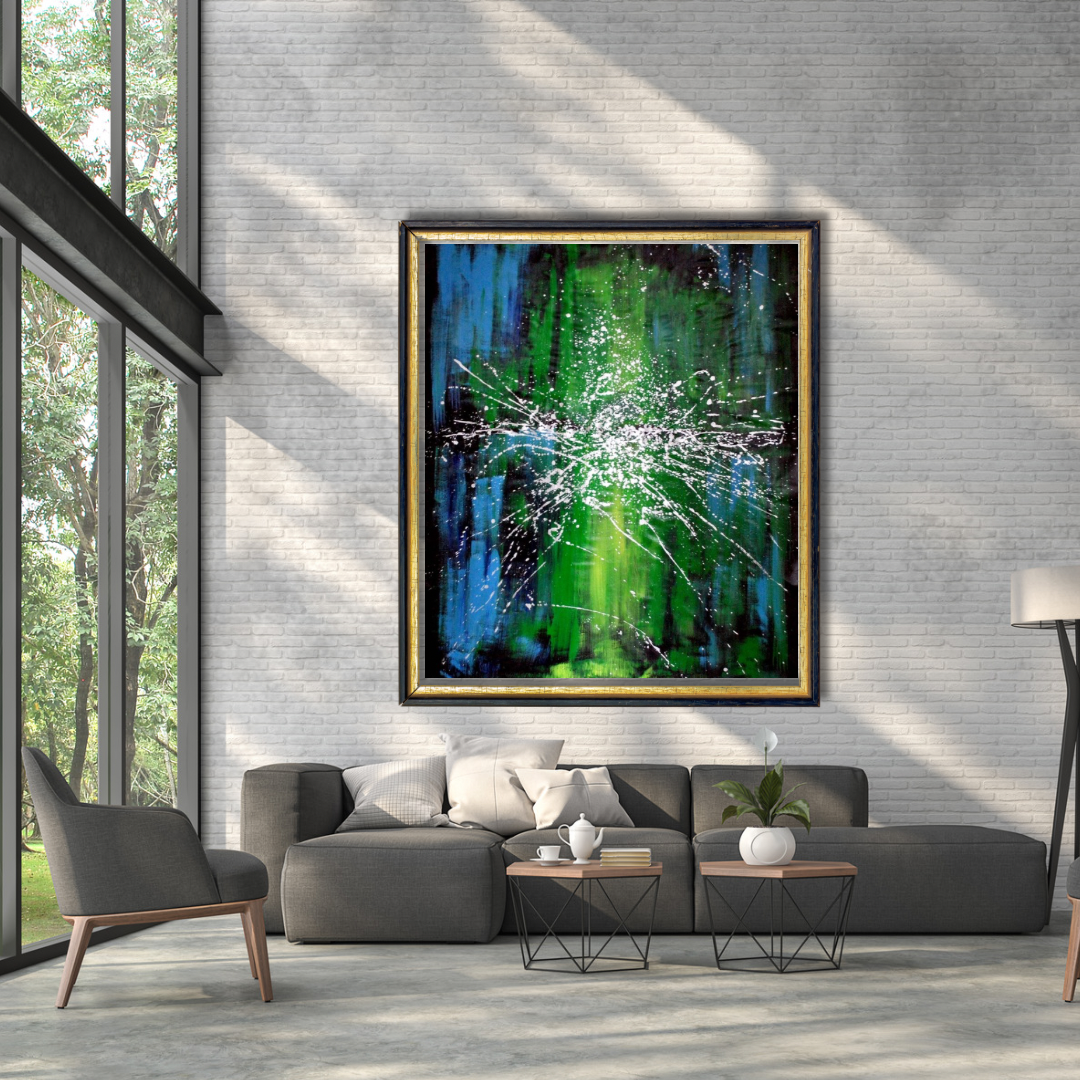 Hipnotyzująca i pełna dynamiki kompozycja inspirowana niezwykłym spektaklem zorzy polarnej. „Aurora Burst” oddaje magię tańczących świateł na nocnym niebie – intensywne odcienie zieleni i błękitu przenikają się, tworząc głębię i iluzję ruchu, a srebrne akcenty dodają całości migotliwego blasku. Centralne rozświetlenie przypomina moment rozbłysku, gdy kosmiczna energia przecina niebo niczym elektryczne pulsowanie zorzy.