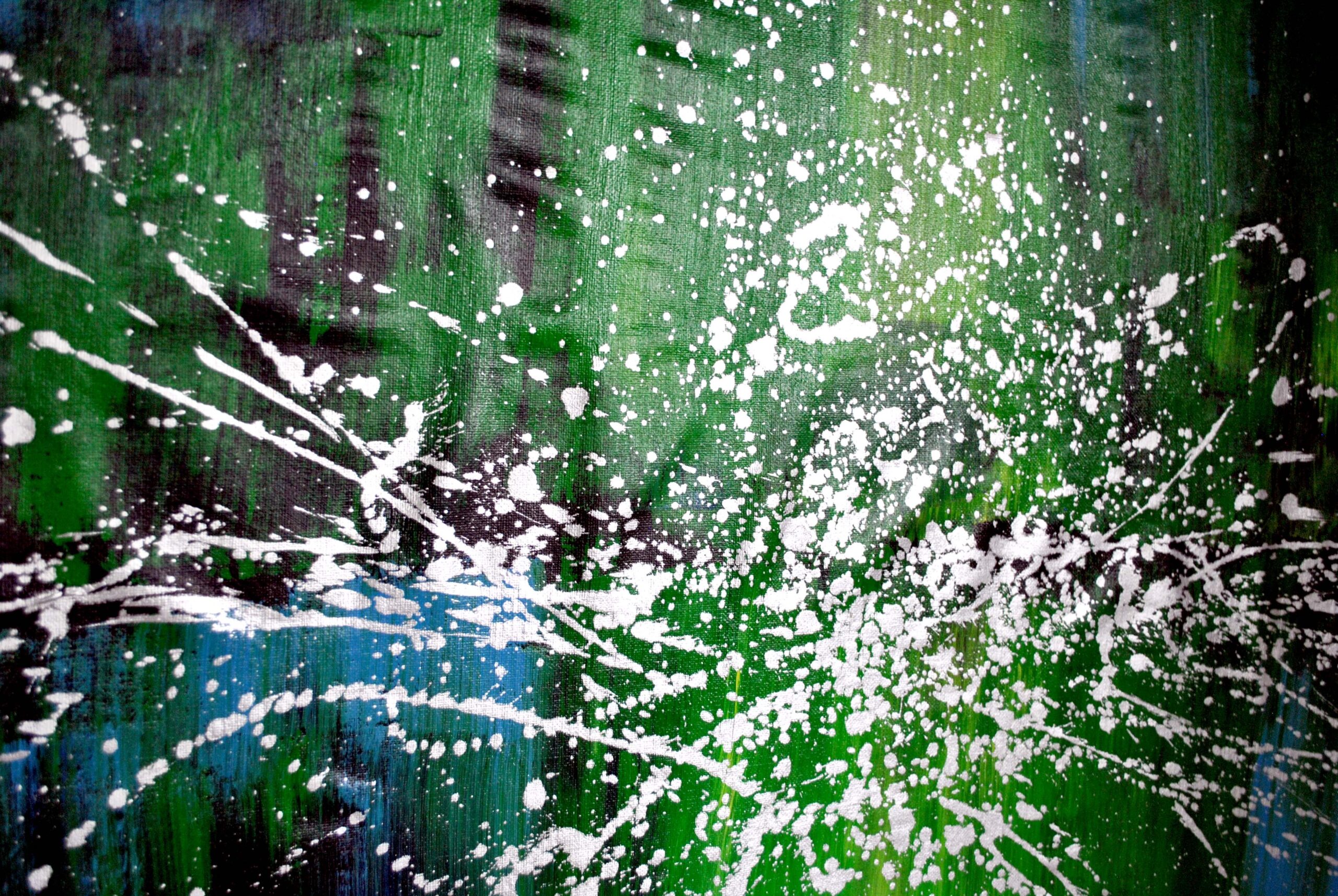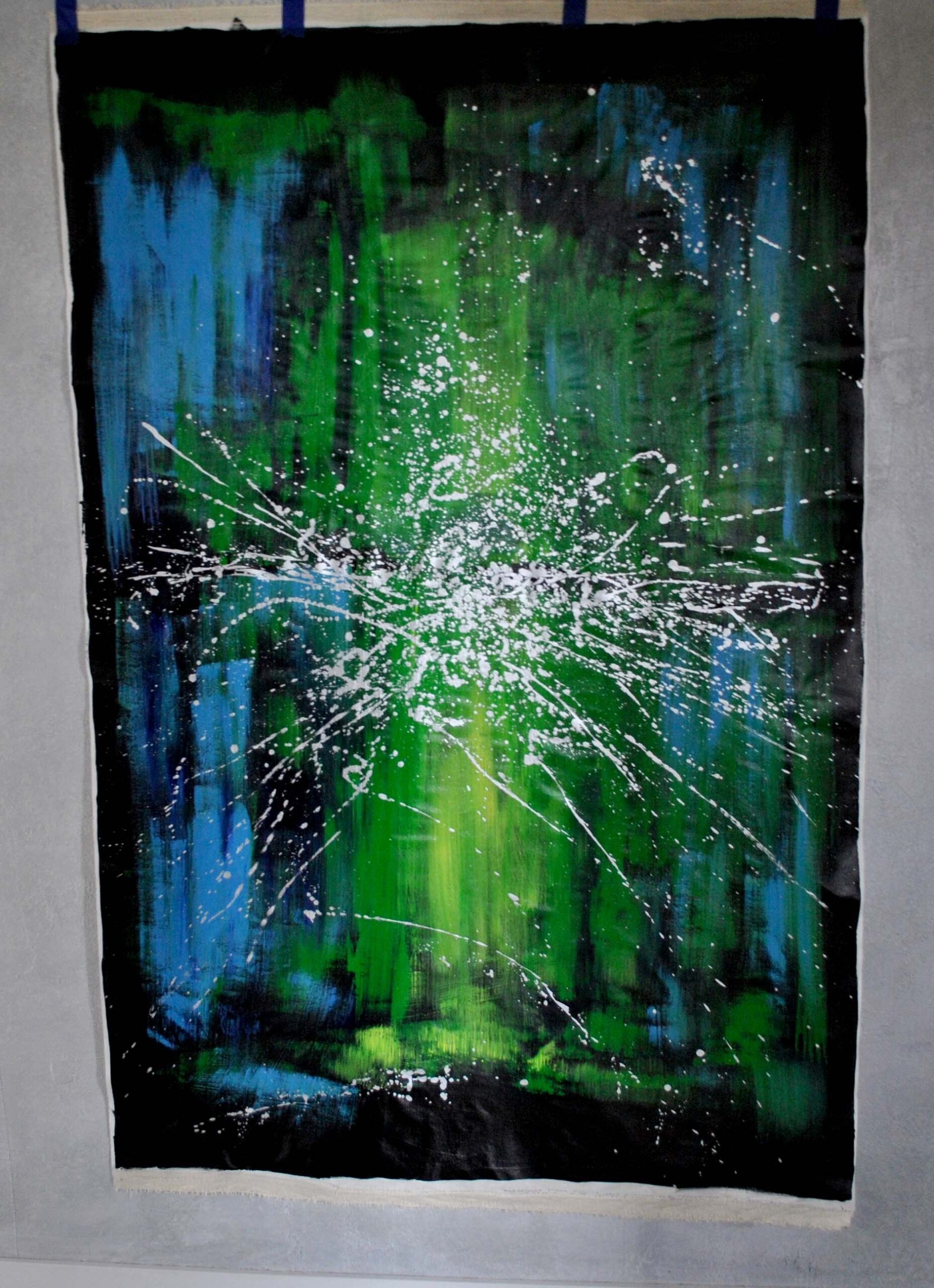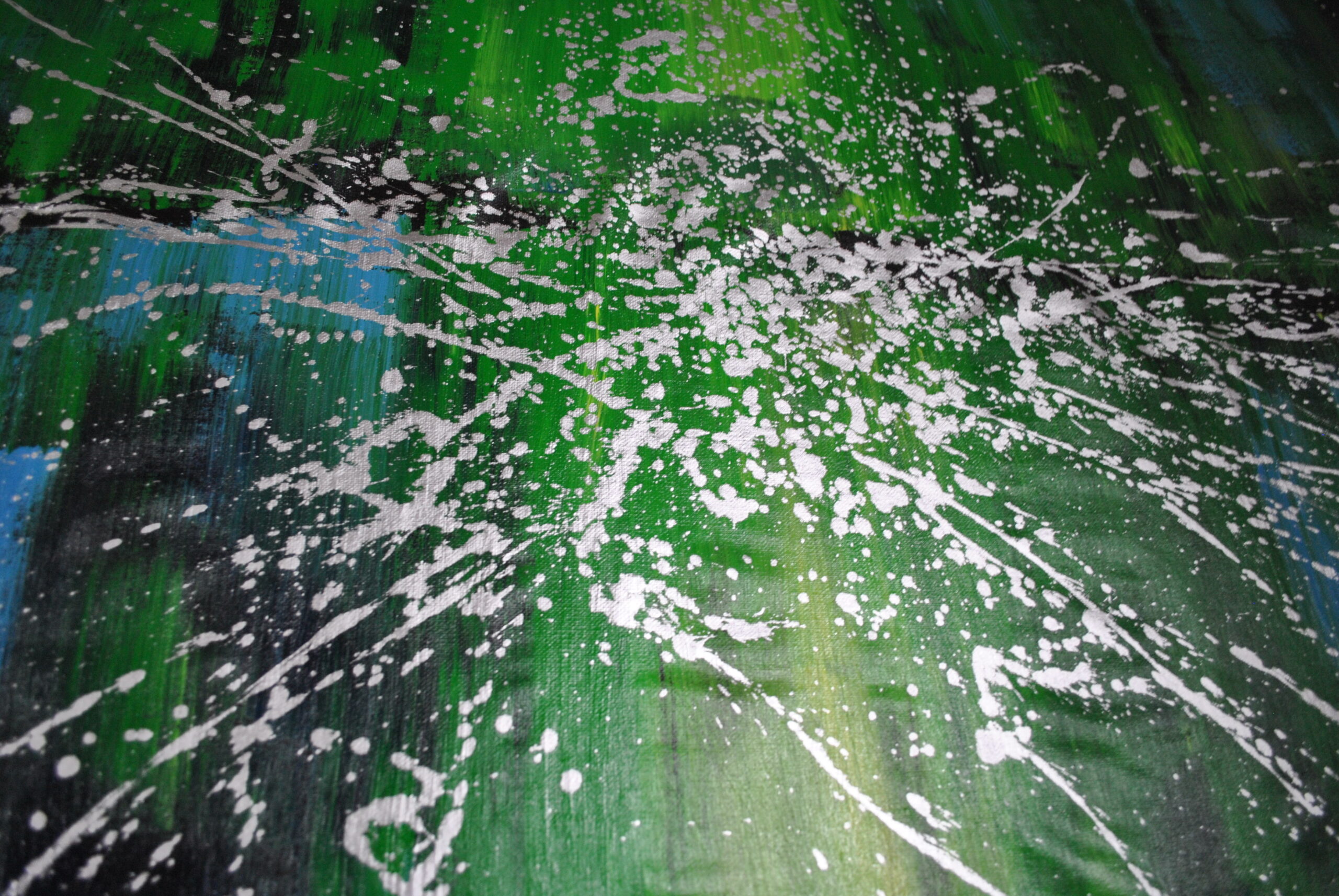 Hipnotyzująca i pełna dynamiki kompozycja inspirowana niezwykłym spektaklem zorzy polarnej. „Aurora Burst” oddaje magię tańczących świateł na nocnym niebie – intensywne odcienie zieleni i błękitu przenikają się, tworząc głębię i iluzję ruchu, a srebrne akcenty dodają całości migotliwego blasku. Centralne rozświetlenie przypomina moment rozbłysku, gdy kosmiczna energia przecina niebo niczym elektryczne pulsowanie zorzy.