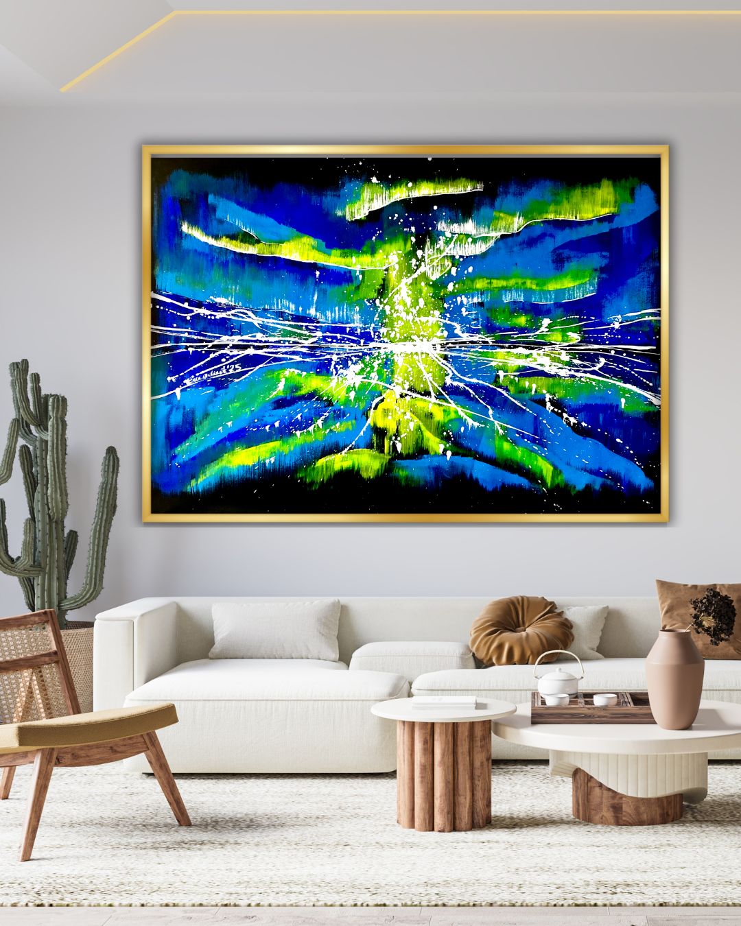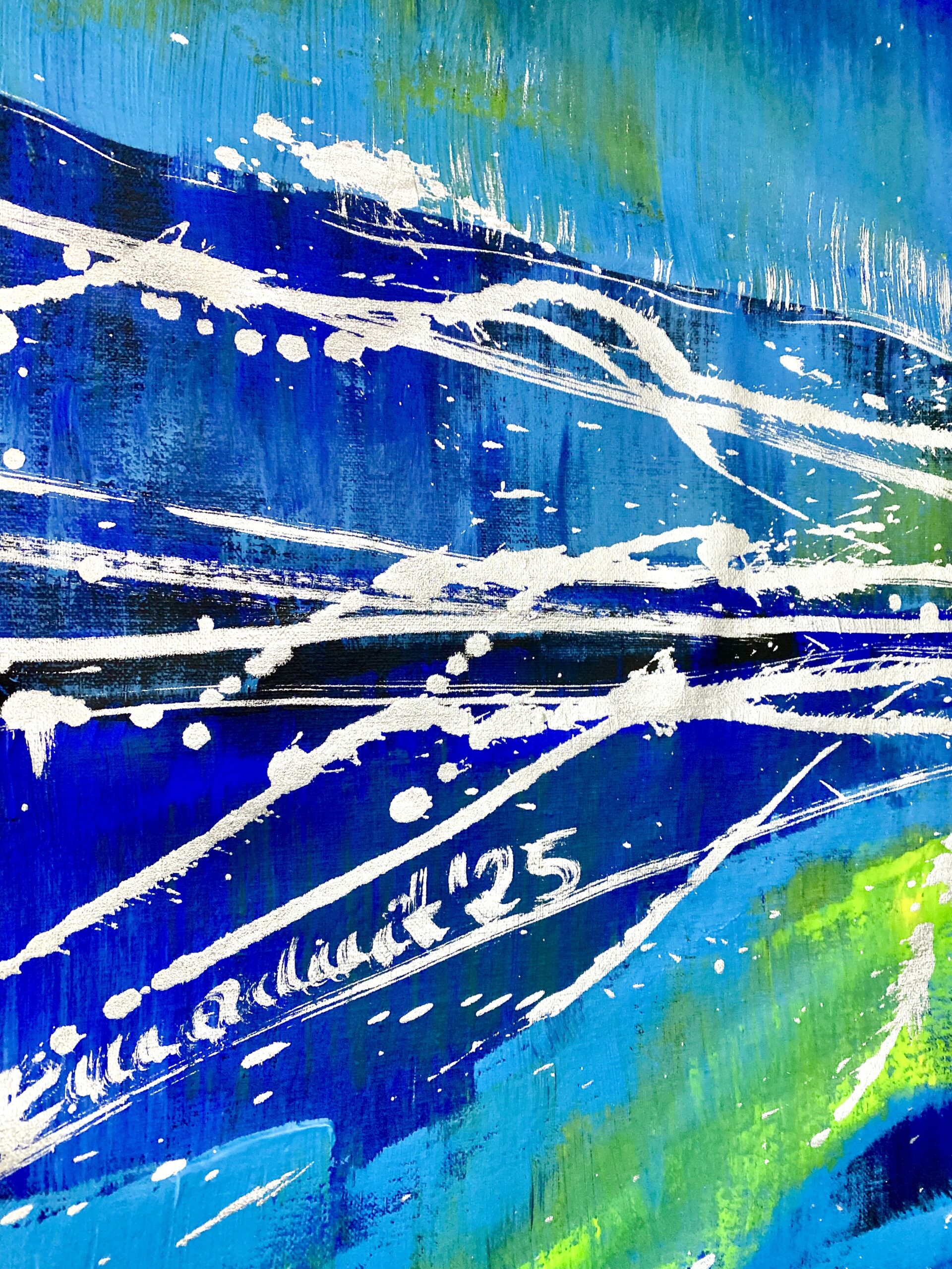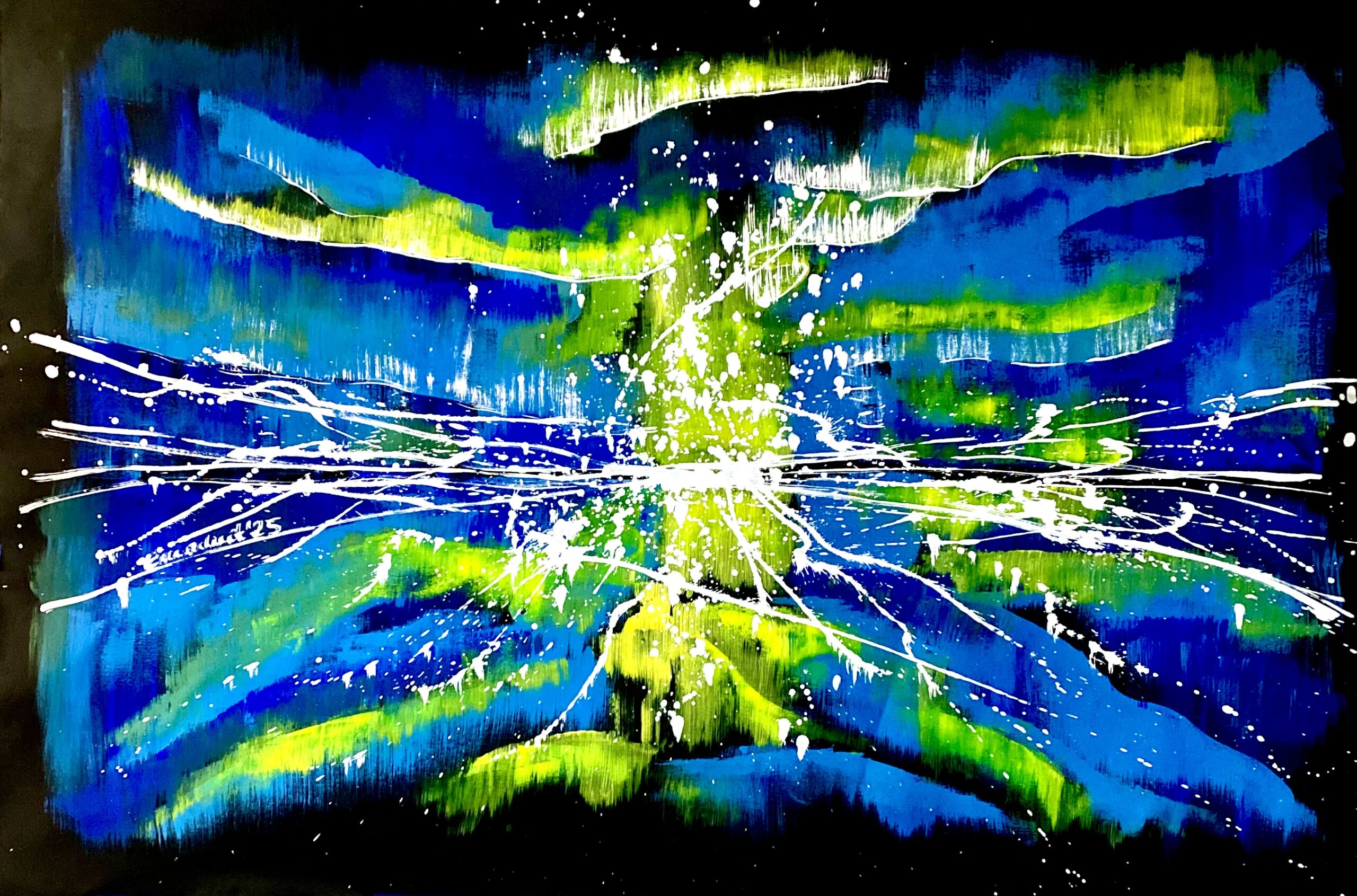 AWAKENING to intensywny, energetyczny obraz abstrakcyjny, w którym splatają się głębokie odcienie błękitu i zieleni z eksplozją złotych refleksów. Kompozycja nawiązuje do zorzy polarnej – naturalnego spektaklu światła, które przenika nocne niebo z tajemniczą siłą. Tu jednak ta siła zostaje przełożona na obraz – pełen ekspresji, ruchu i emocji.