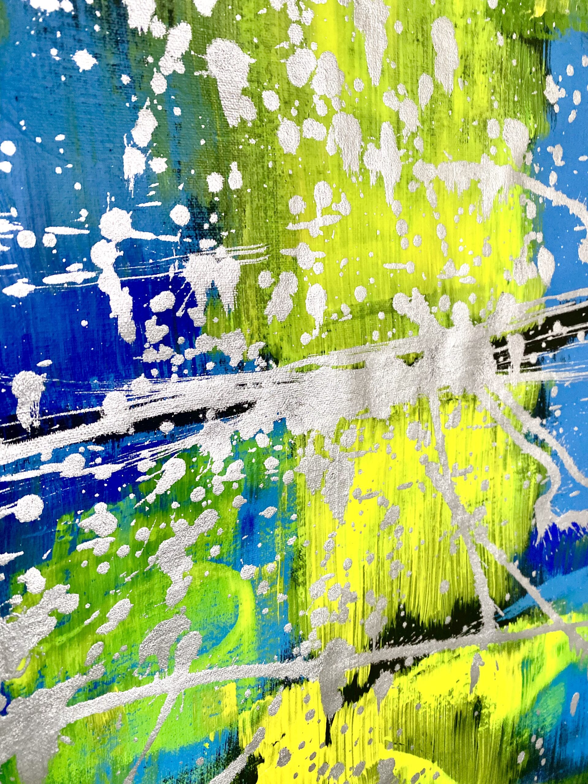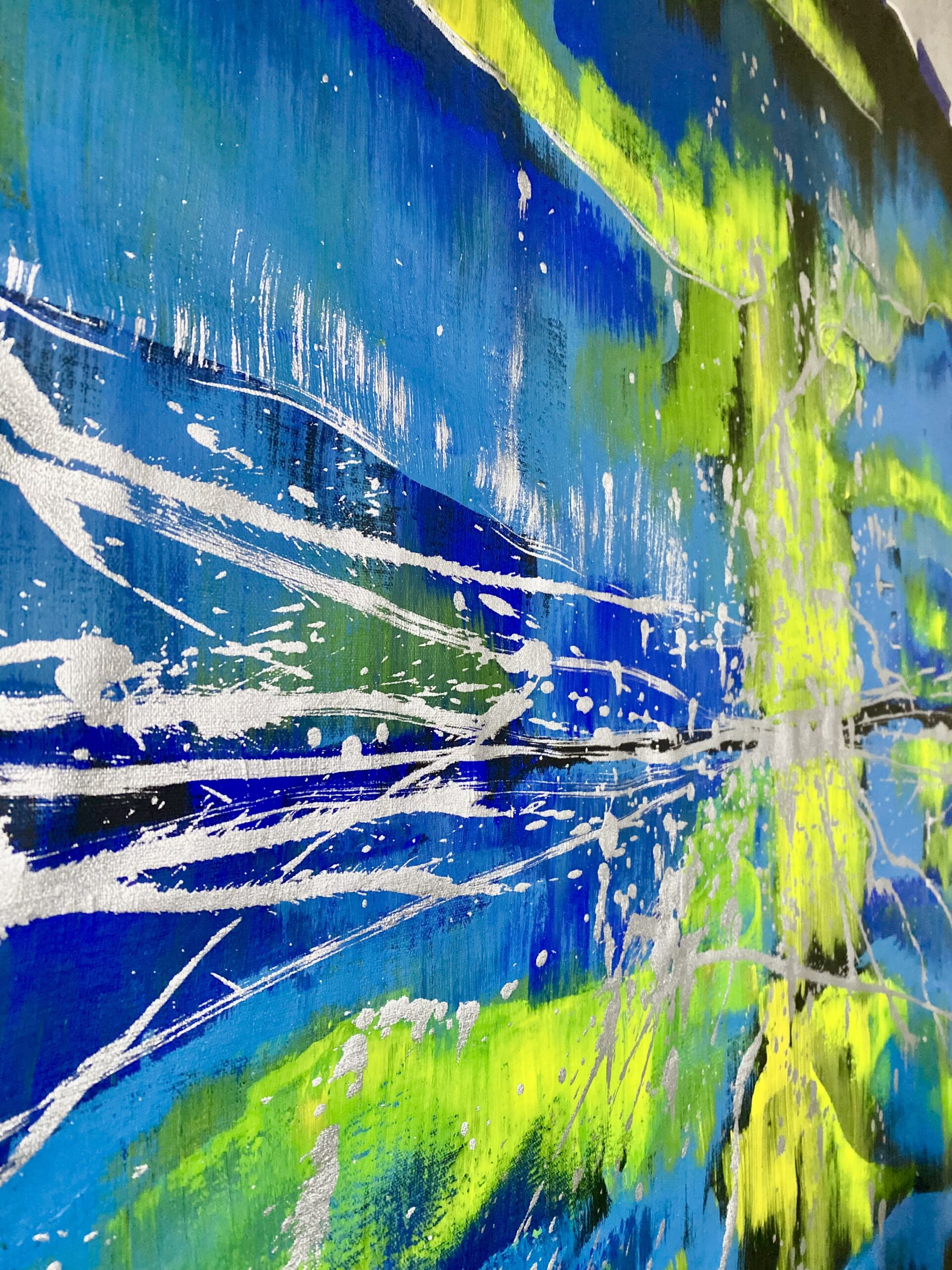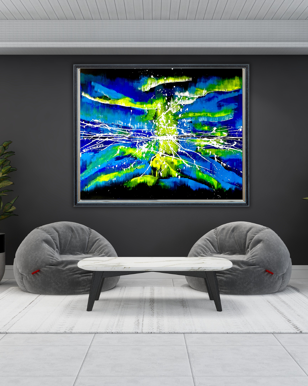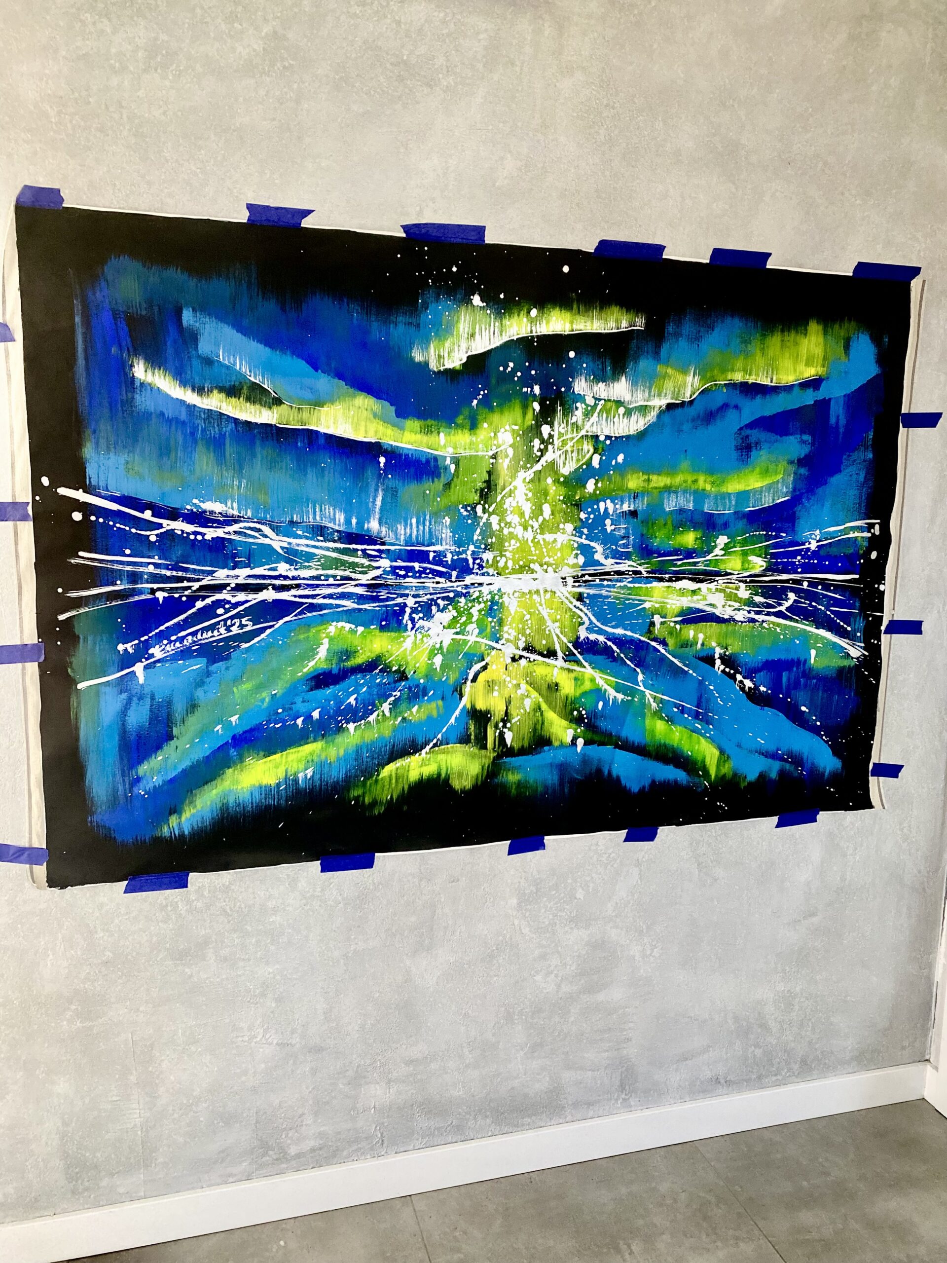 AWAKENING to intensywny, energetyczny obraz abstrakcyjny, w którym splatają się głębokie odcienie błękitu i zieleni z eksplozją złotych refleksów. Kompozycja nawiązuje do zorzy polarnej – naturalnego spektaklu światła, które przenika nocne niebo z tajemniczą siłą. Tu jednak ta siła zostaje przełożona na obraz – pełen ekspresji, ruchu i emocji.