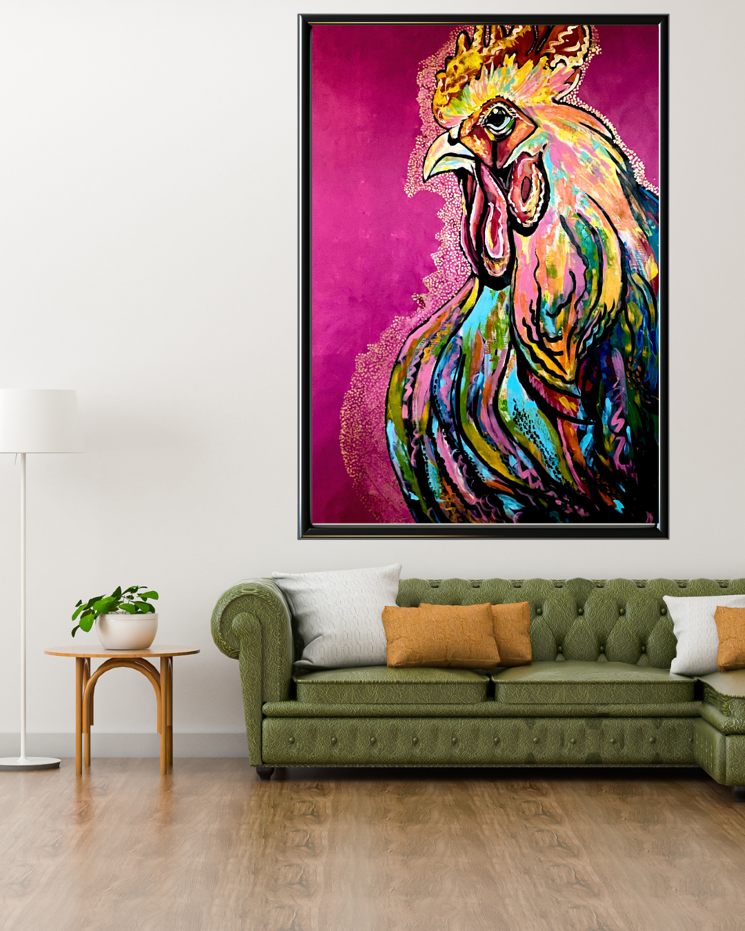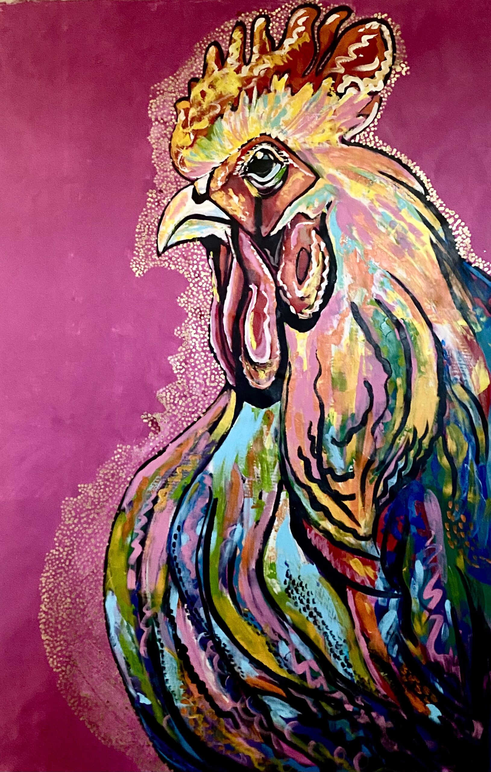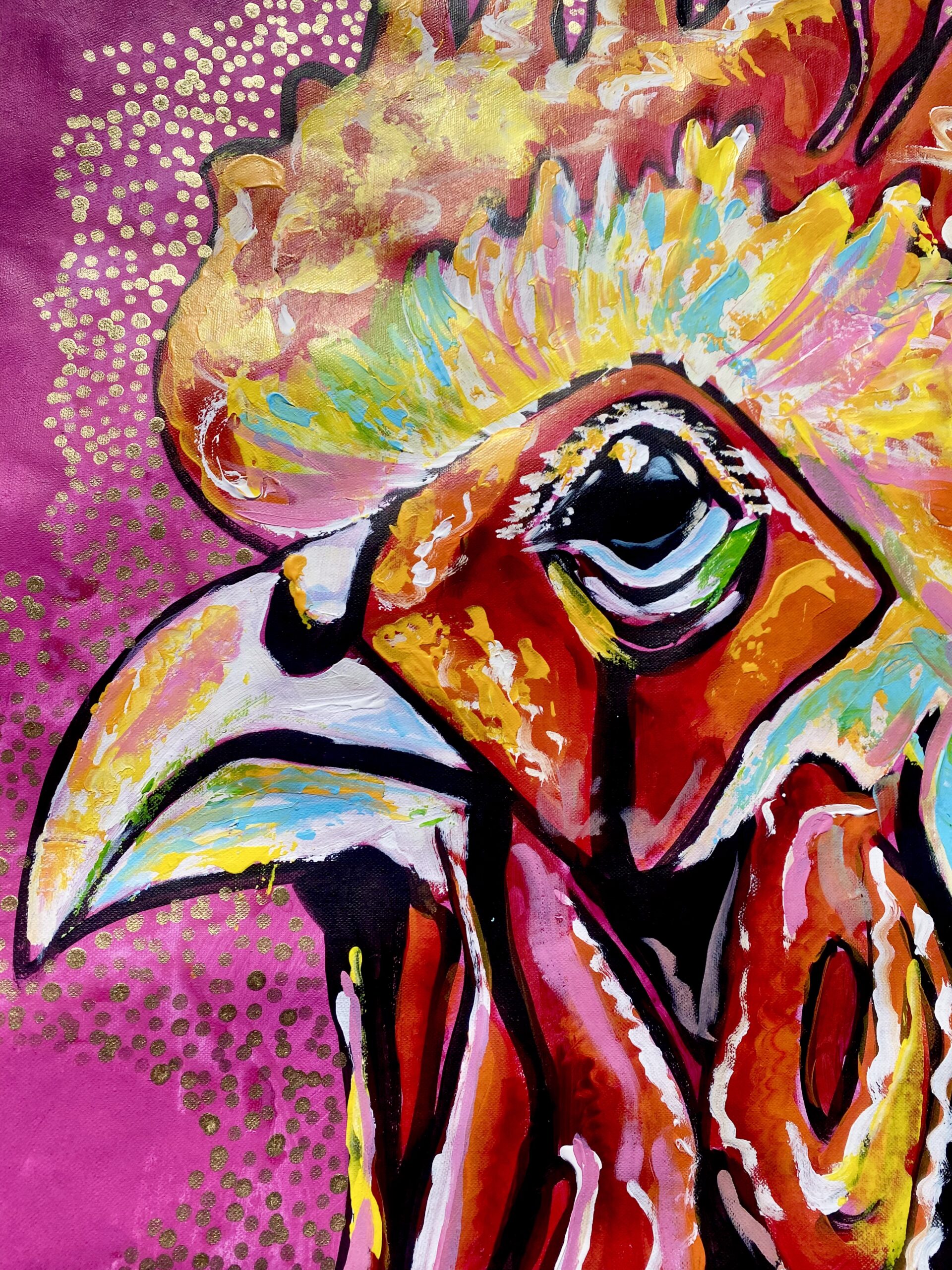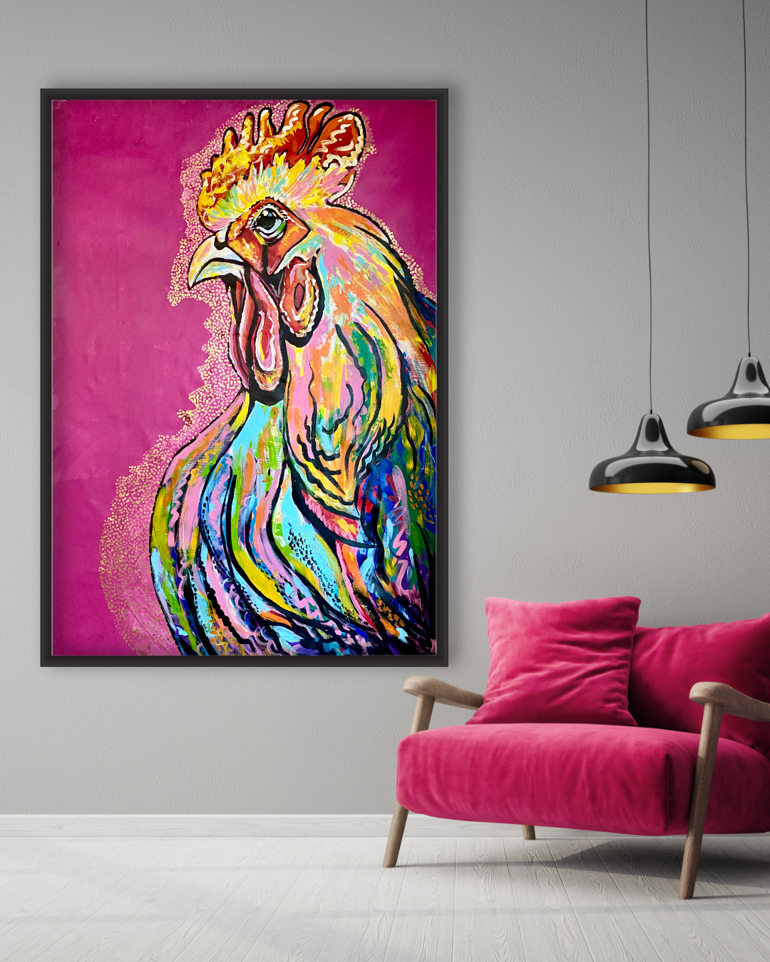 Dynamiczny, pełen ekspresji portret koguta – symbolu siły, odwagi i… dumy z bycia sobą – został wykonany w 100% ręcznie. Każda warstwa farby, każdy detal grzebienia i piór powstały z myślą o wnętrzu, które nie boi się wyrazistości.