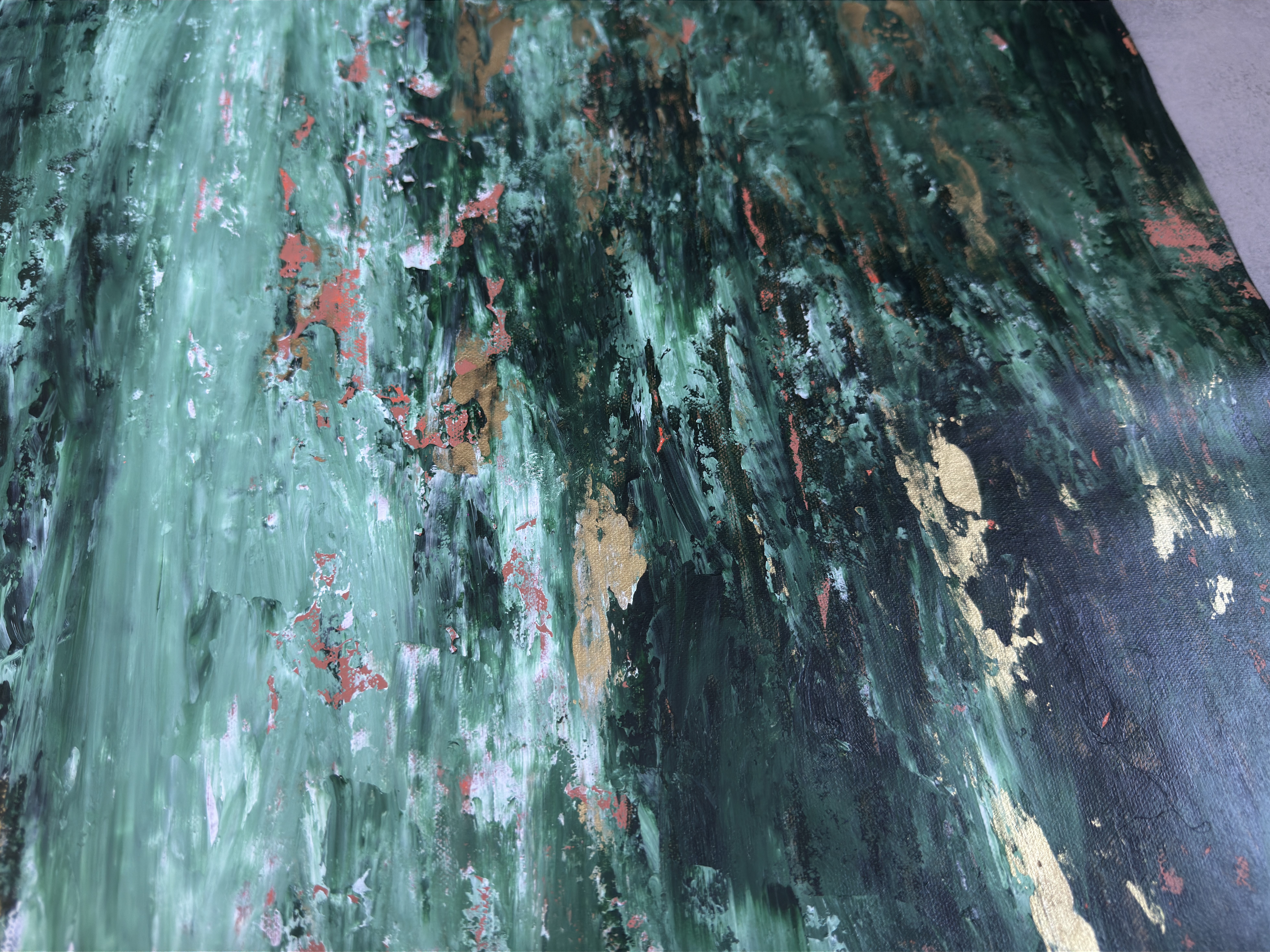 obraz ręcznie malowany, akryl, nowoczesna sztuka, pejzaż abstrakcyjny, złoto na zieleni, obraz do salonu, obraz z lasem, harmonia, natura w domu, sztuka współczesna.