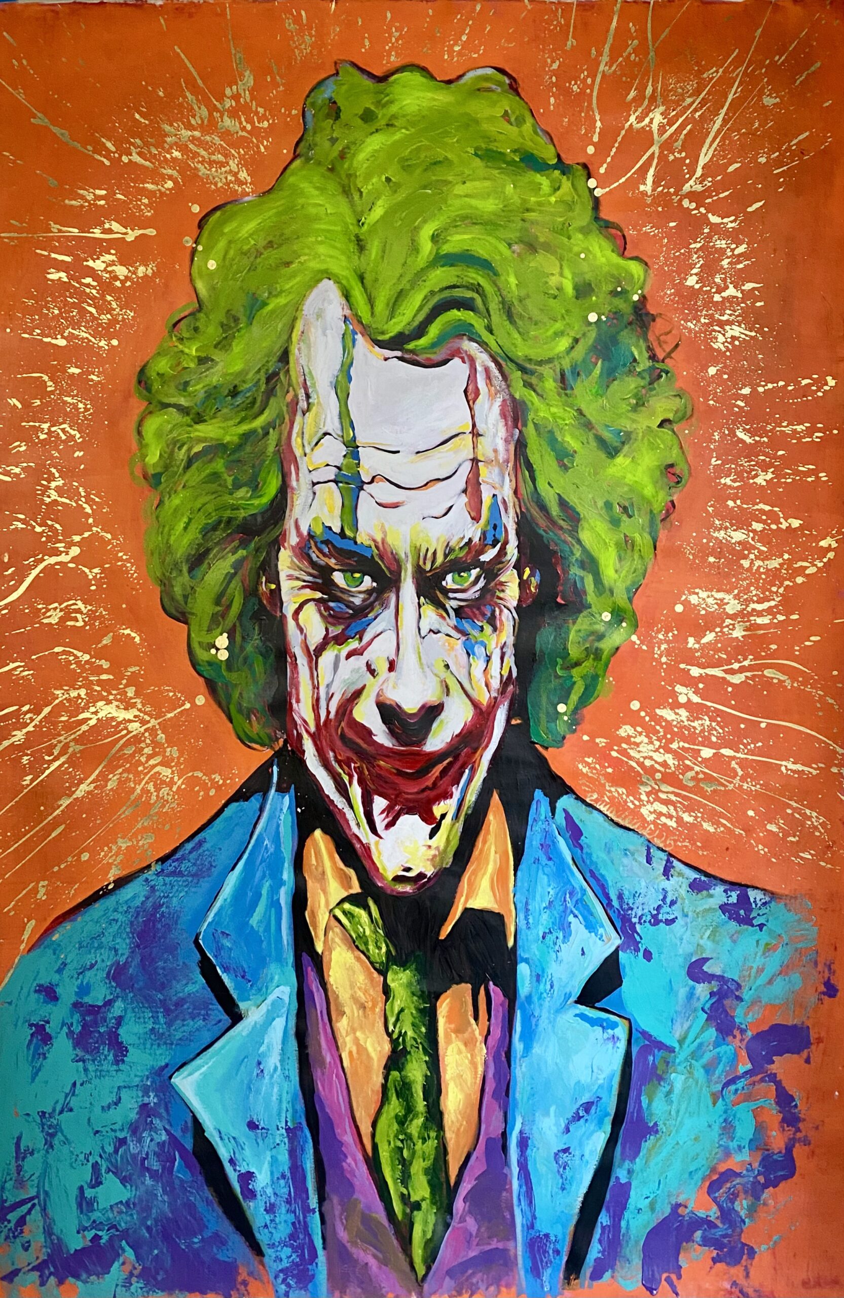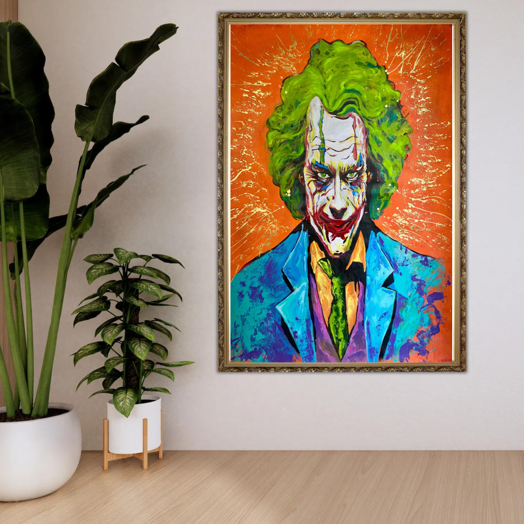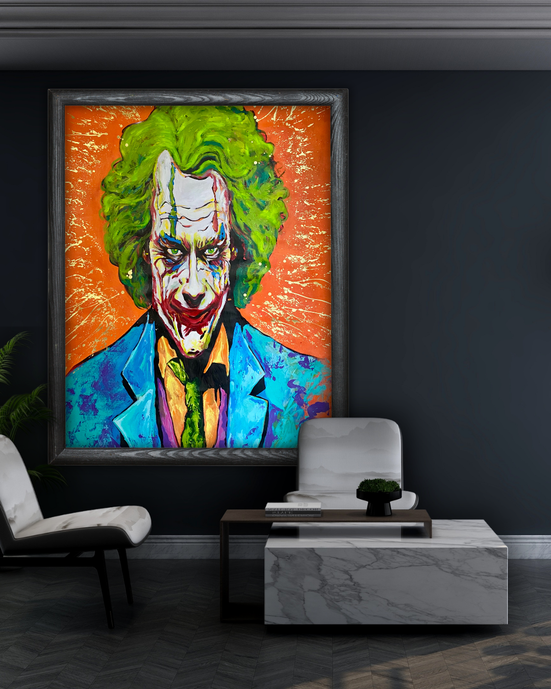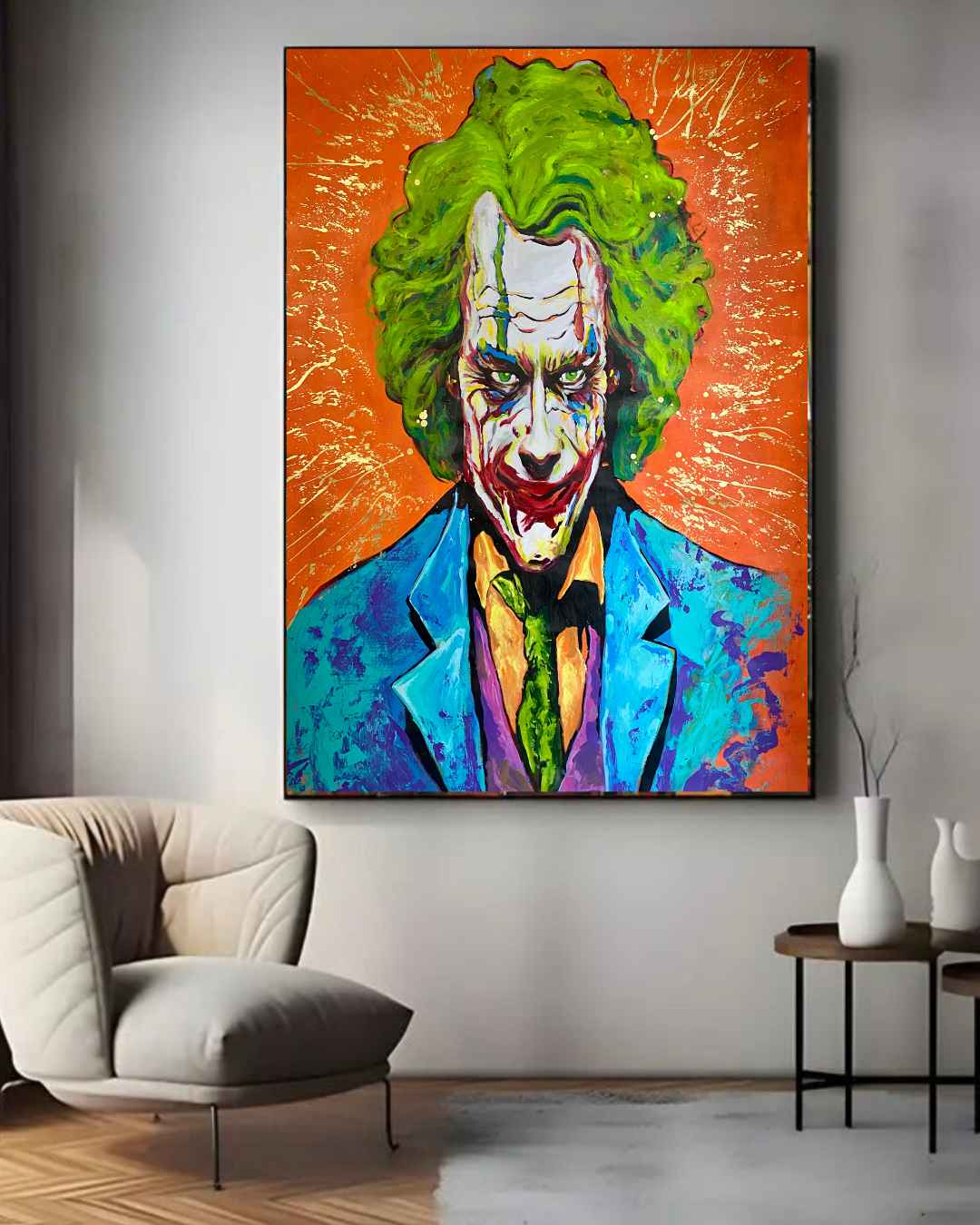 obraz Joker, obraz inspirowany Jokerem, obraz postać z filmu, nowoczesny obraz Joker, obraz Batman, obraz Joker na ścianę, sztuka współczesna, obraz popkulturowy, ręcznie malowany Joker, ekspresyjny obraz, obraz do loftu, mocny obraz do salonu, Joker painting, pop-art Joker, nowoczesna dekoracja Joker