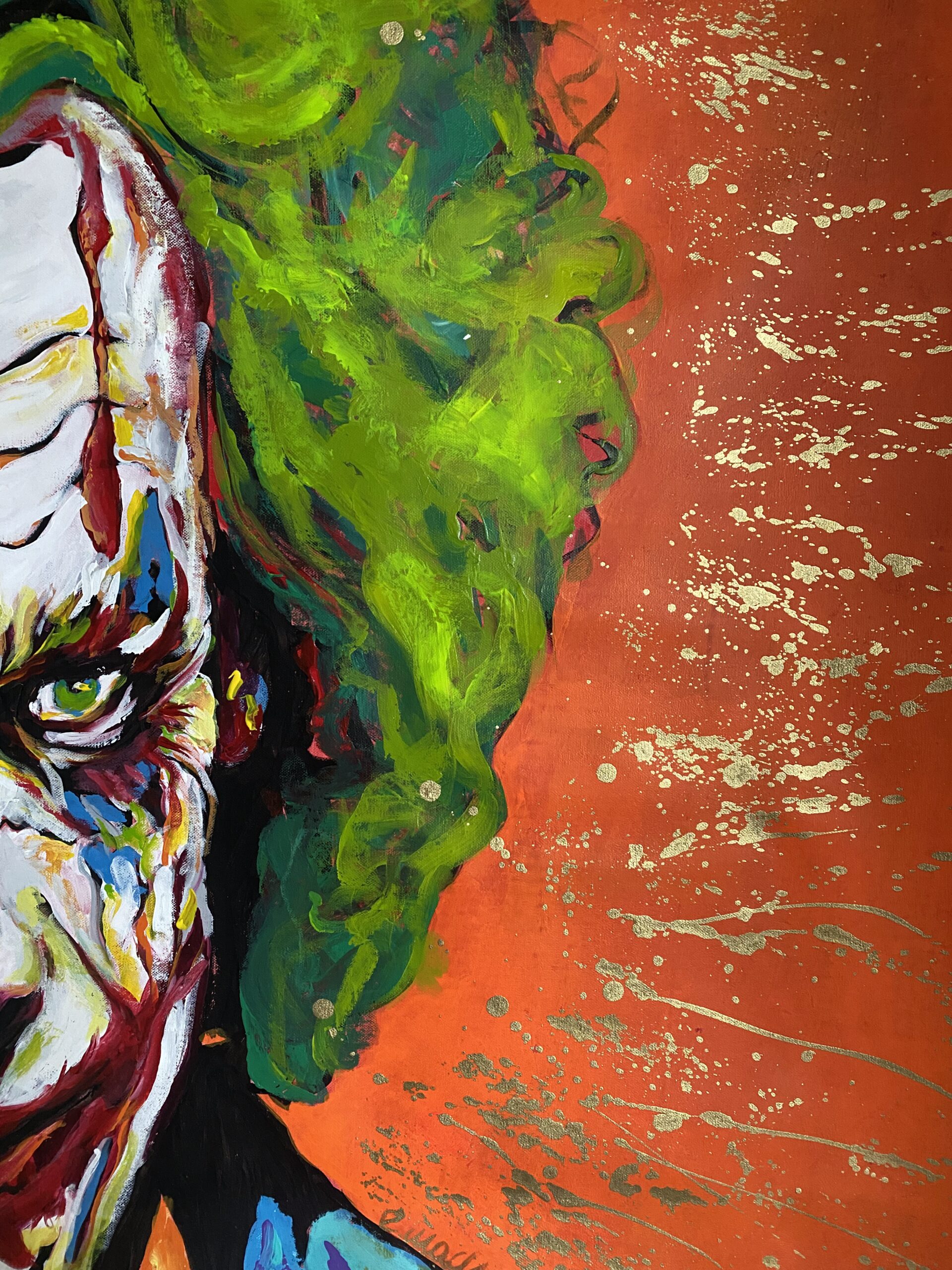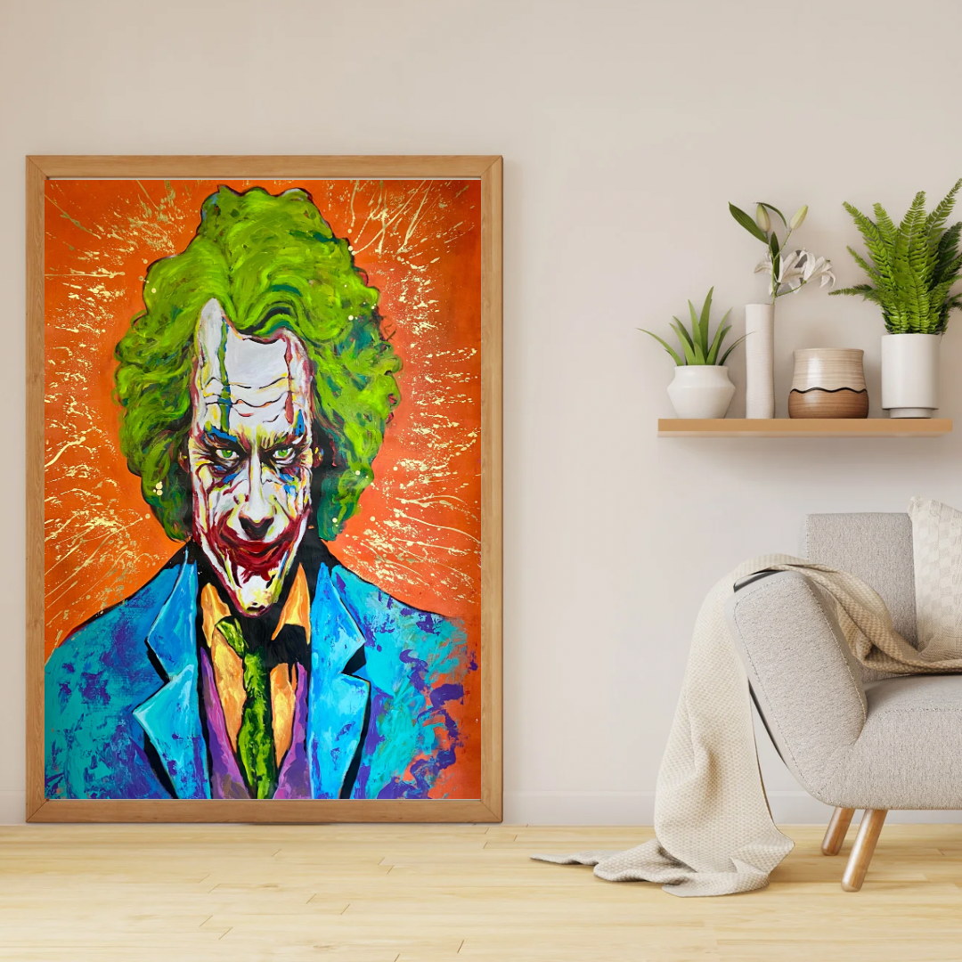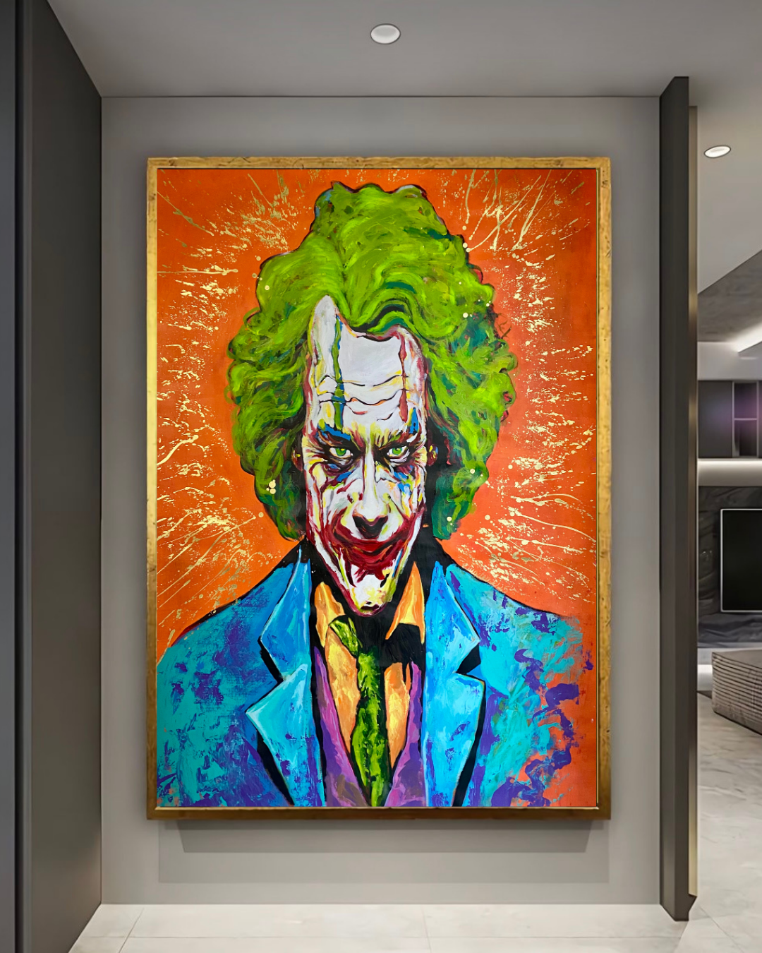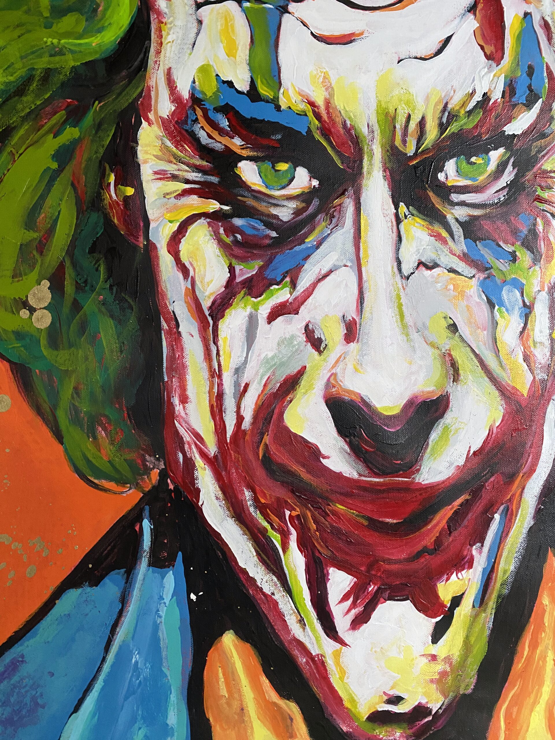 obraz Joker, obraz inspirowany Jokerem, obraz postać z filmu, nowoczesny obraz Joker, obraz Batman, obraz Joker na ścianę, sztuka współczesna, obraz popkulturowy, ręcznie malowany Joker, ekspresyjny obraz, obraz do loftu, mocny obraz do salonu, Joker painting, pop-art Joker, nowoczesna dekoracja Joker