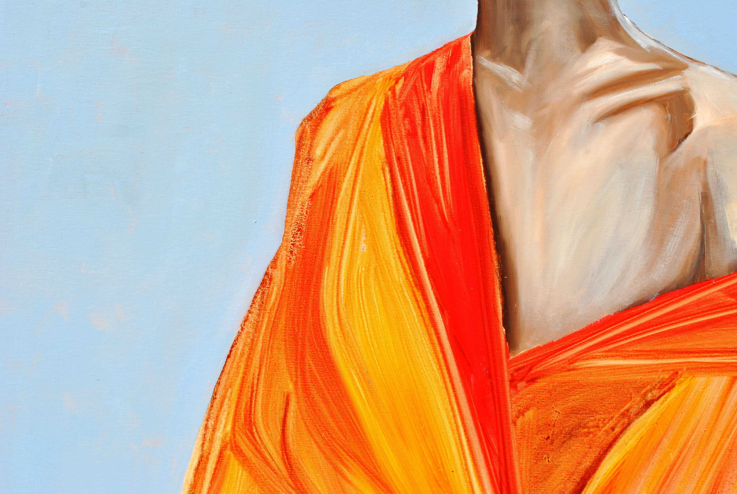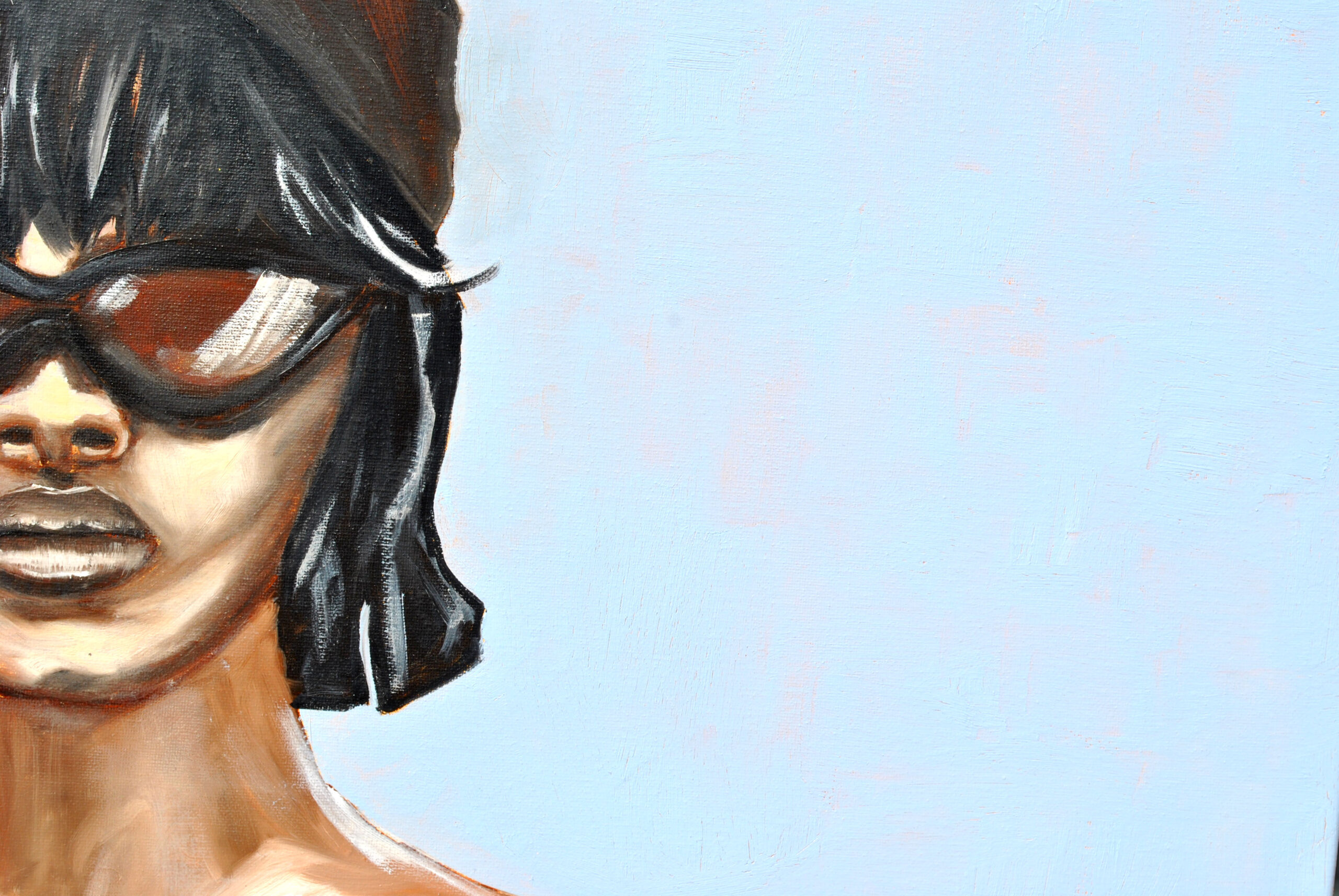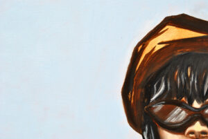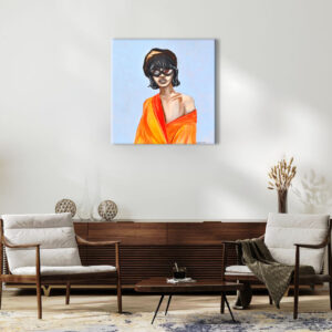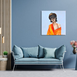 Postać przedstawiona na obrazie nosi duże, ciemne okulary przeciwsłoneczne, co dodaje jej pewnego dystansu, a jednocześnie pozwala widzowi na własną interpretację – kim jest, co kryje się za tym spojrzeniem? Strój, zdominowany przez nasycone odcienie pomarańczu i czerwieni, tworzy mocny kontrast z jej bladą skórą, co sprawia, że postać wydaje się niemal eteryczna, jakby unosiła się na tle delikatnego, chłodnego błękitu. Całość obrazu jest niezwykle stylowa, nowoczesna i pełna miejskiego szyku.